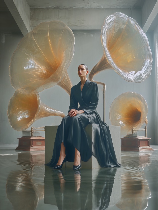 この作品について 最初に目に入るのは、人物を囲む半透明アンバーの巨大な蓄音機フォーンと、足元に広がる浅い水面の対比です。視線が止まる理由は、黒いサテンのドレス... -