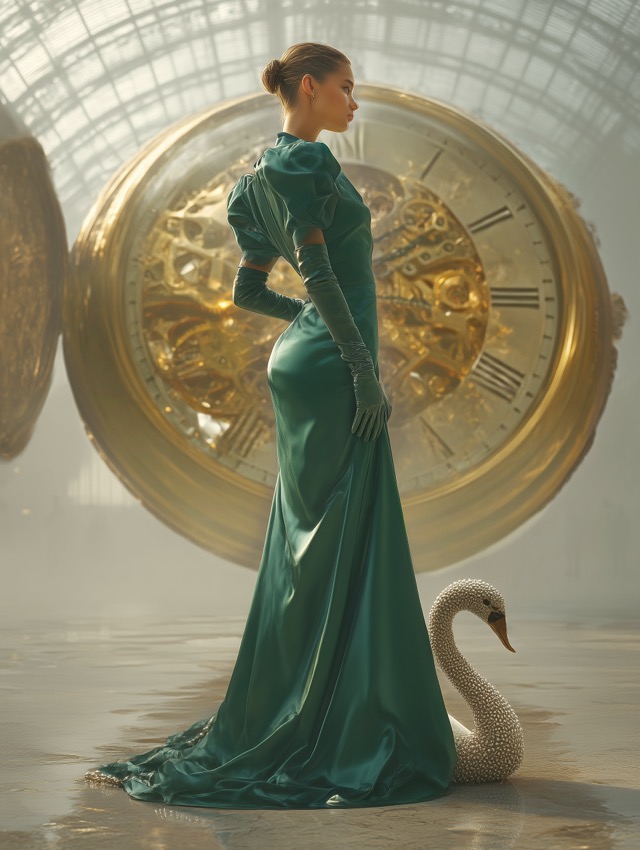 白鳥と時計のシュールファッションアート